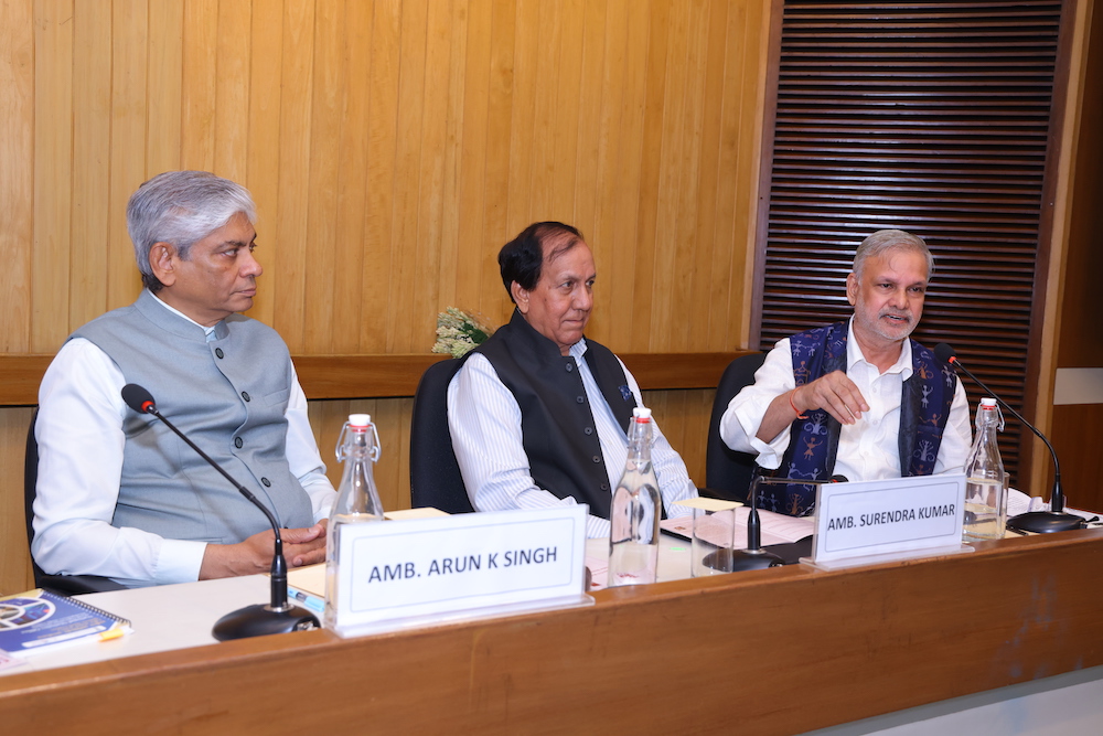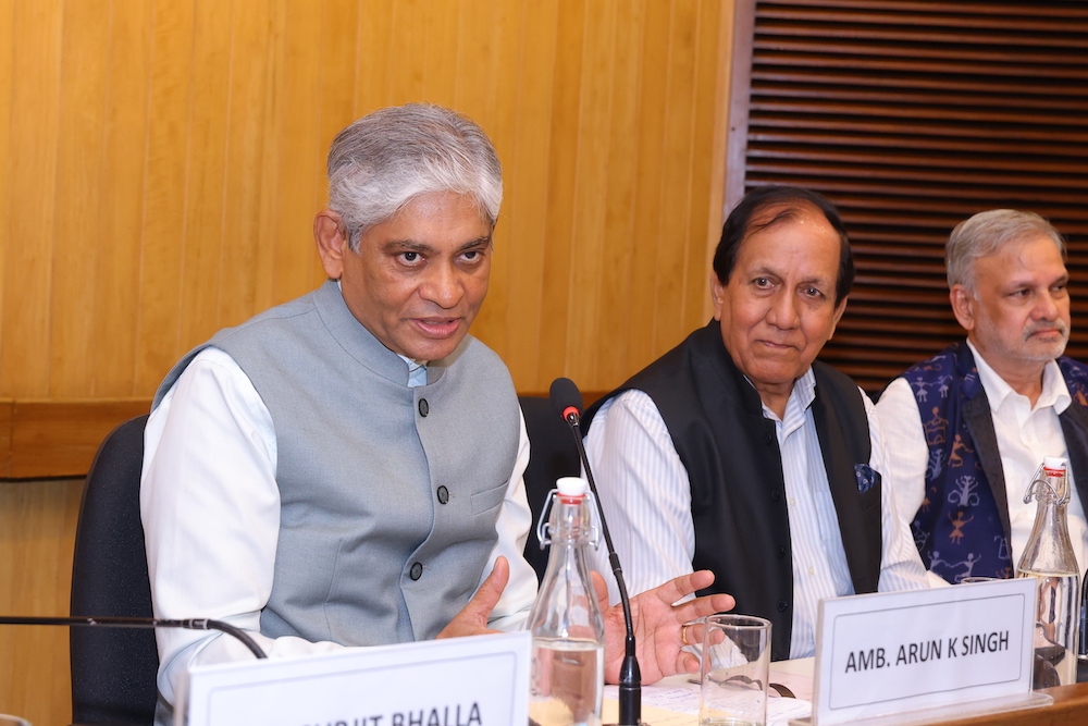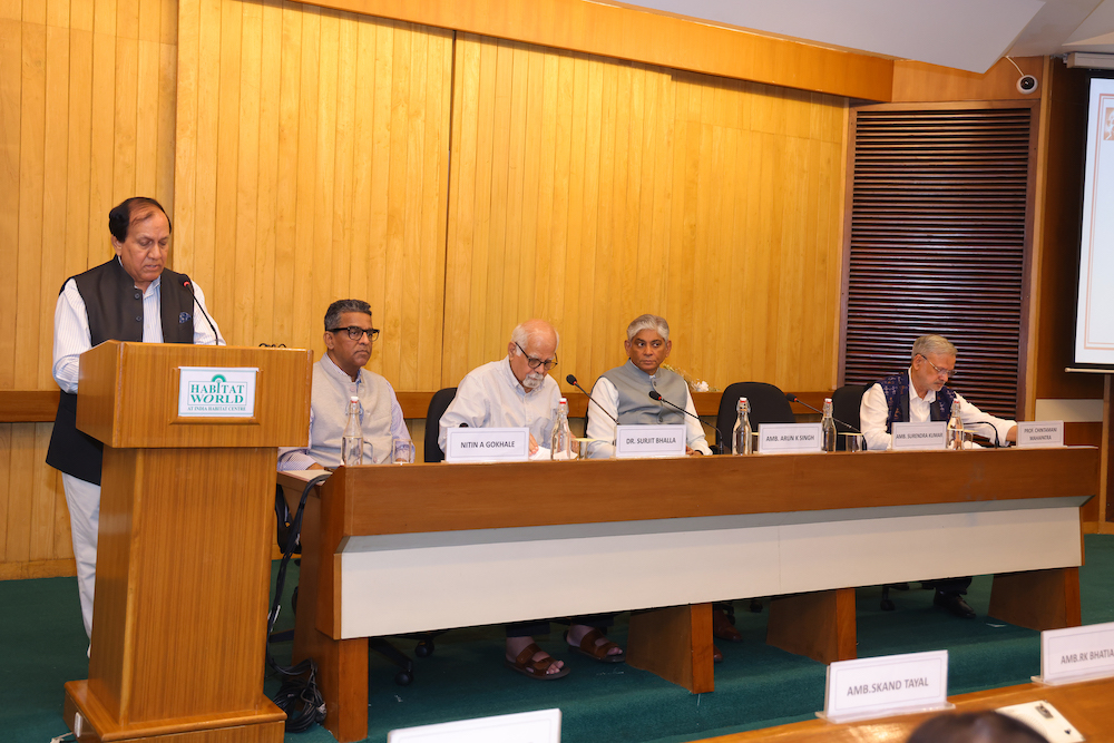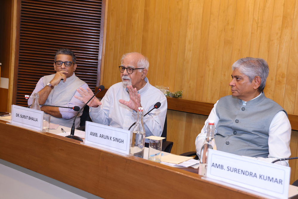 Amb. Arun Kumar Singh sharing his perspective ; on his right Dr Surjit Bhalla & Nitin Gokhale and on his left surendra kumar & Chintamani Mahapatra