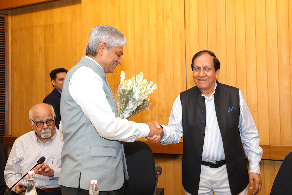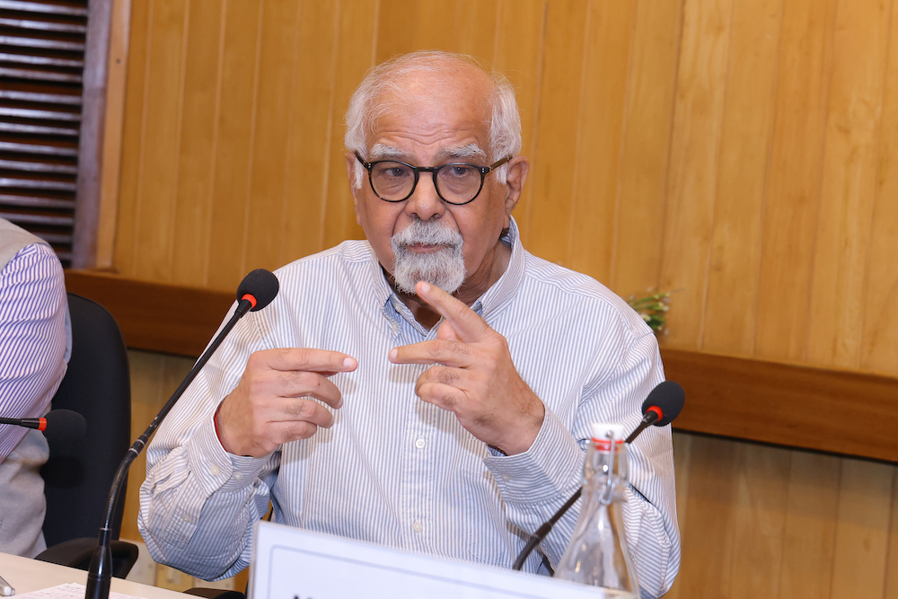 Dr Surjit Bhalla explaining the impact of Trump’s tariff war on India- US Relations, on his right Nitin Gokhale & on his left Amb. Arun Kumar Singh